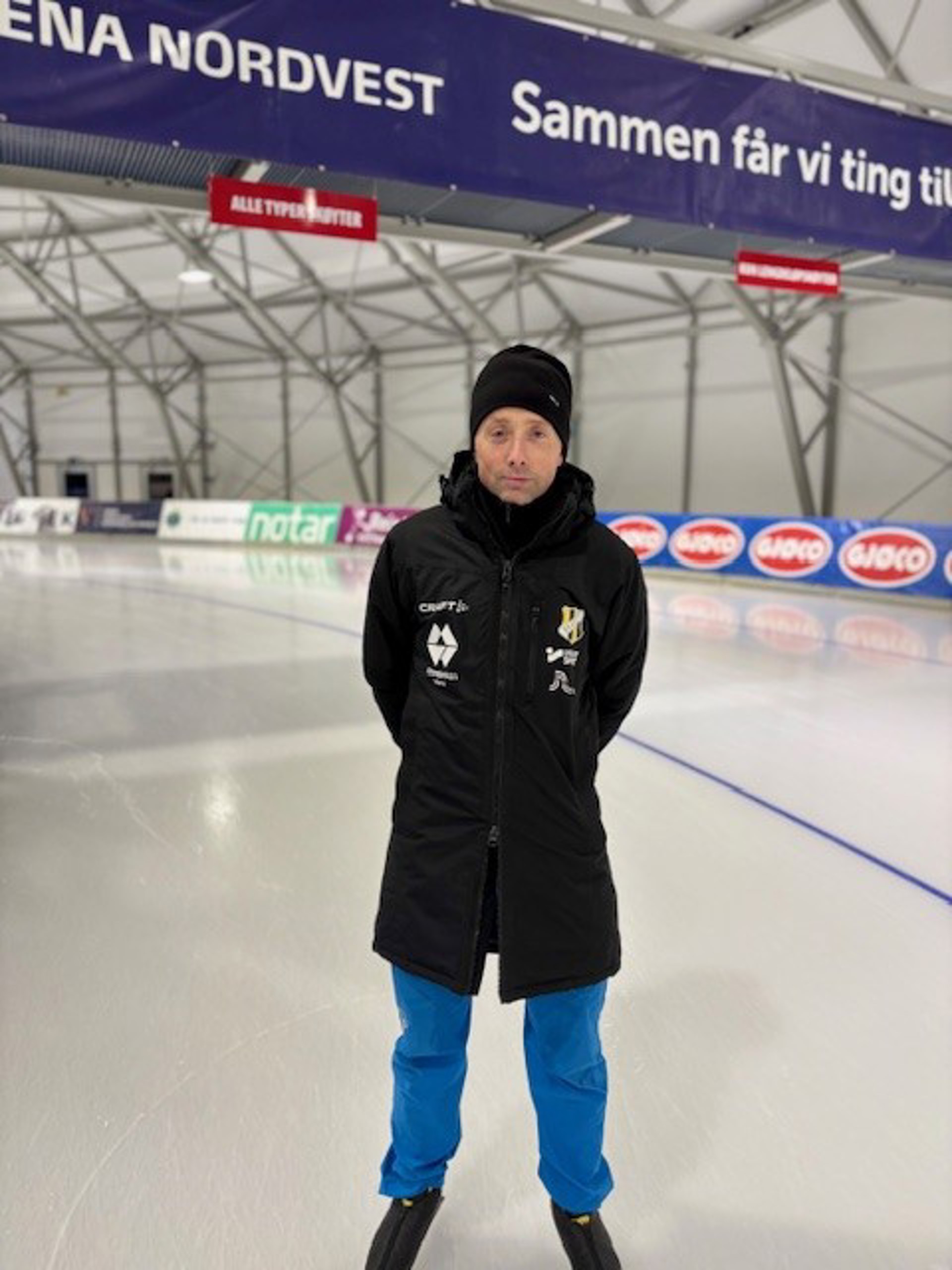 Øystein forteller at ishallen Arena Nordvest er åpen i skøytesesongen fra 1. september til april.